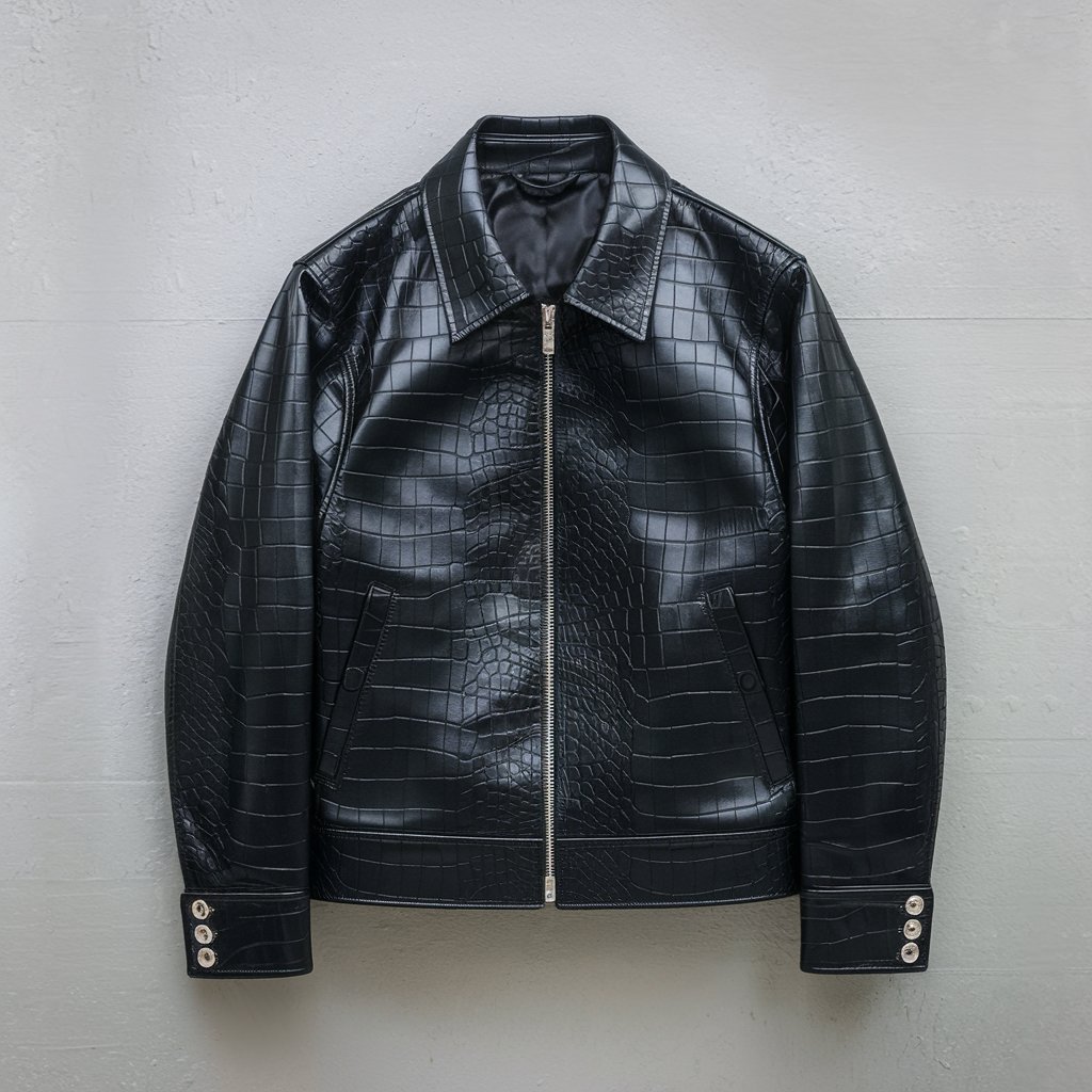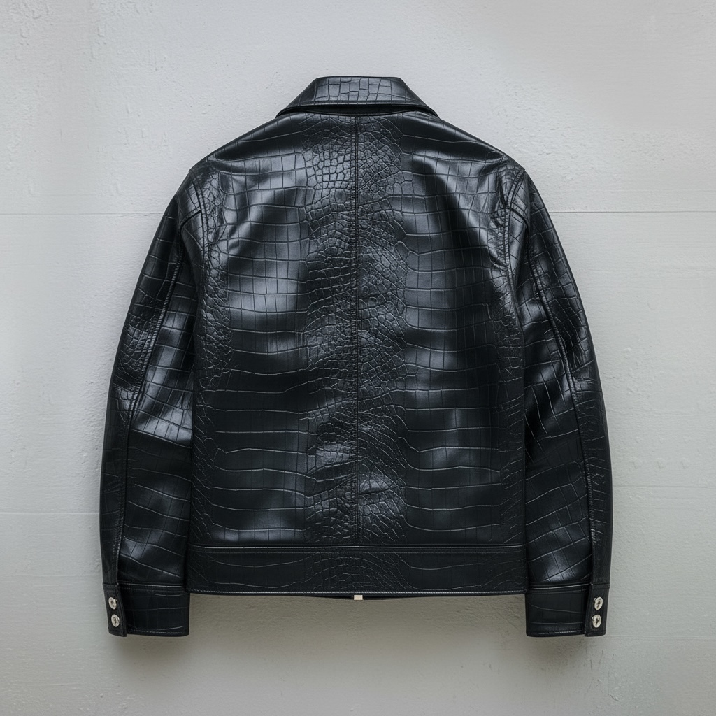 This is texture you can feel. The Noir Croc is an unapologetic statement of power, meticulously crafted from premium leather that has been deeply embossed with a formidable crocodile pattern. The rich, tactile scales are designed to catch the light, revealing a stunning depth and dimension. We balanced this primal luxury with our signature bomber silhouette: the classic stitched collar and cuffs. This is VEYLORIA at its boldest, a rare and audacious piece, handcrafted for the true individual.